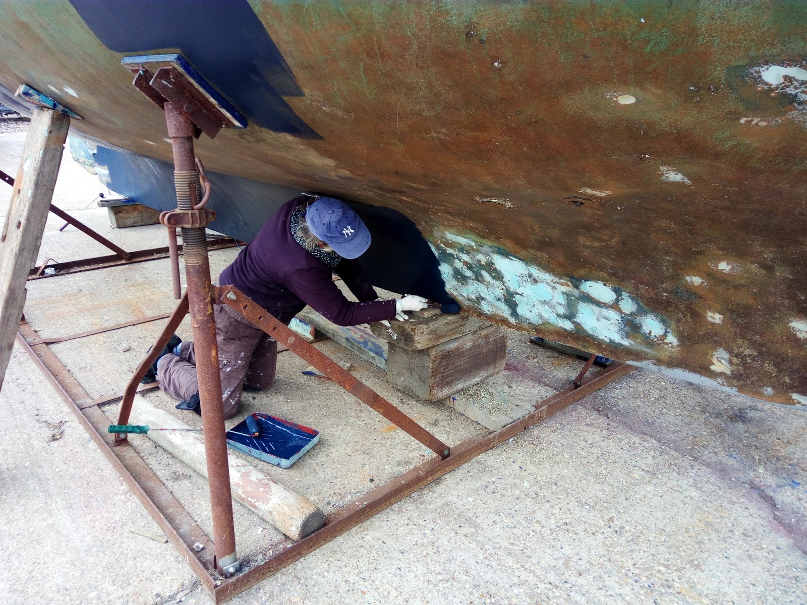 Again, it's all in the preparation so there's stuff to finish off and get ready but then finally we're off - hats on to save boat painter's blue rinse and gloves to save having to scour our hands afterwards until they are bright red.